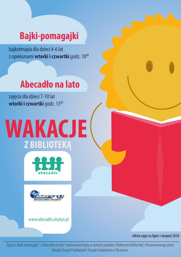 Zajęcia „Bajki pomagajki” i „Abecadło na lato” realizowane będą w ramach projektu „Wybieram bibliotekę” sfinansowanego przez Miejski Zespół Profilaktyki i Terapii Uzależnień w Olsztynie.
