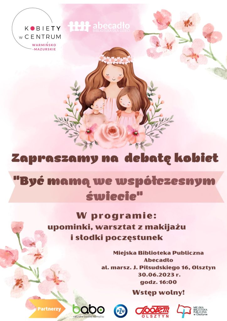 Debata kobiet „Być mamą we współczesnym świecie” 30.06.2023 godz. 16 00 przez Abecadło · Opublikowano 27 czerwca 2023 · Zaktualizowano 28 czerwca 2023 Kobiety w Centrum Warmińsko – Mazurskie i biblioteka Abecadło zapraszają 30.06.2023 godz. 16 00 na debatę kobiet „Być mamą we współczesnym świecie”. Wstęp wolny.
