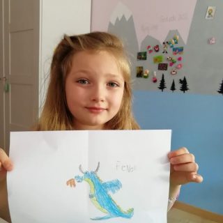 Maja przysłała kolejną pracę: pięknie narysowanego smoka. Zamieszczamy też drugie zdjęcie, na którym Maja pokazuje...